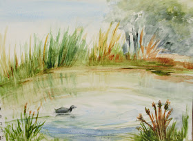 | Cathy's painting of the cattail ringed Pond with some pretty complex reflections. |